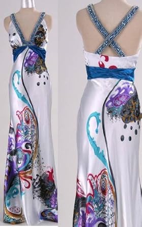 Printed smooth charmeuse long gown Heavy rhinestones v-neck band trim The pictures of the dress are taken using our own actual dress.