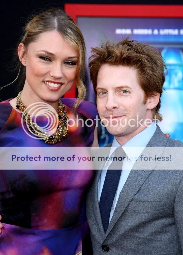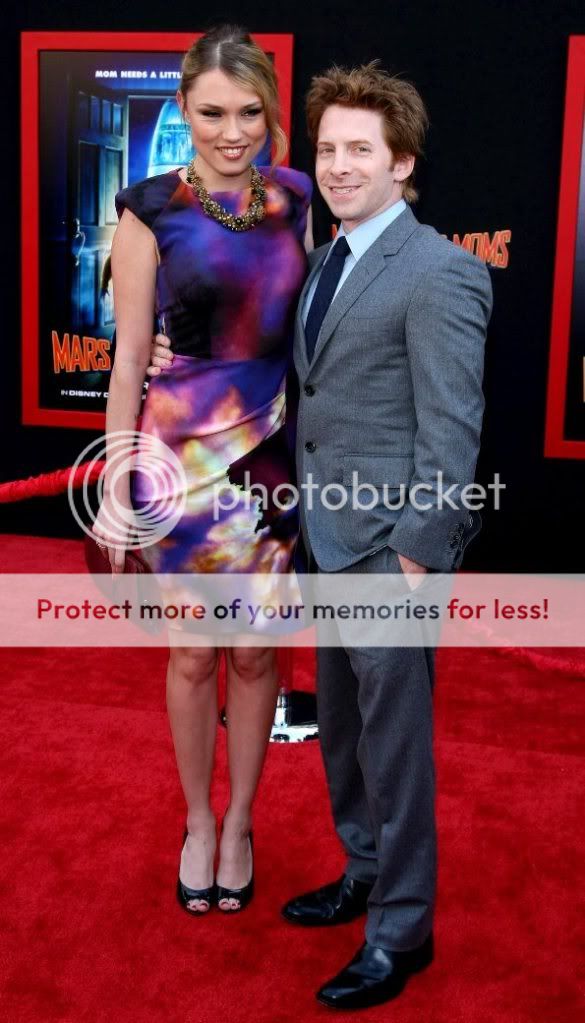 Adorable couple Clare Grant and Seth Green attend the Mars Needs Mom's premiere in Los Angeles on March 6, 2011. The couple was dressed by celebrity stylist Joey Tierney. Clare was a stunner wearing a colorful dress by Nicole Miller, a Kotur clutch, Christian Louboutin heels, and Miriam Haskell jewelry.